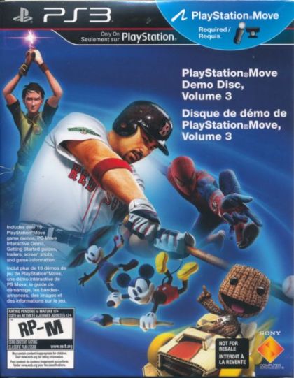 PlayStation Move Demo Disc volume 3 includes demos of: MLB 12 the show, Sorcery, LittleBigPlanet 2 Move Pack, Datura, Everybody Dance, 4AM, The Unfinished Swan, LittleBigPlanet Karting, Tiger Words PGA Tour 13, Ninja Gaiden 3, Epic Mickey 2, MIB Alien Crisis, The Amazing Spider-man, Grand Slam Tennis 2, Sports Champions 2