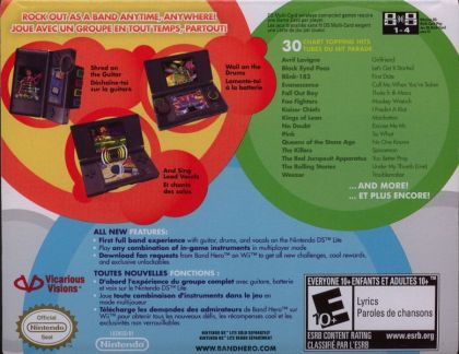 Music fans can now take their whole band and play their favorite music on the road anytime, anywhere with Band Hero for the Nintendo DS Lite. Band Hero takes the fun of social gaming beyond the living room and allows families and friends to play together as a band with the DS Lites' built in microphone, the brand new innovative Drum Grip that gives players the ability to lay down beats on their DS Lite, and the signature Guitar Hero Guitar Grip guitar gameplay. This cooperative, family-friendly addition to the Guitar Hero series boasts the biggest set list for a Nintendo DS music game to date and is comprised of some of the hottest tracks from music's most popular artists including: Blink-182, Avril Lavigne, The Killers, KT Tunstall and Fall Out Boy.
