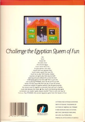 Pyramid is an action puzzle game similar to Tetris. Stones of various shapes and sizes fall from the top of the screen, and you need to move and rotate the stones so they fill complete lines at the bottom of the screen. Should the stones reach the top of the screen the game is over. If you get in trouble, there are a limited number of bombs that can be used to clear a small section of stones at the bottom hopefully giving you more room to work with. Unlike the square and rectangular shaped pieces found in Tetris, each of the shapes in Pyramid have one or more angles to them making complete lines more difficult to form.