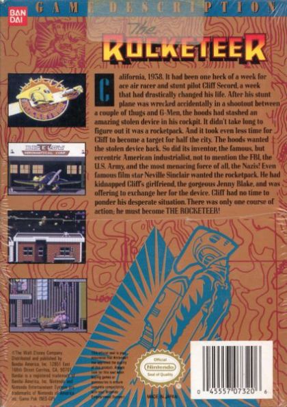 The Rocketeer is a side-scrolling, run-and-jump (and sometimes fly) game. About halfway through the first stage, the Rocketeer is able to scavenge jet fuel power-ups, in addition to health and ammo power-ups. The fuel power-ups allow him to use his namesake power and fly for short distances. The Rocketeer has 6 offensive options available from the start of the game, limited only by the amount of ammunition points he has in reserve: A punch (requires no ammo points and is therefore unlimited), pistol (1 ammo point per fire), tommygun (2 ammo points), spread gun (3 ammo points), grenade (5 ammo points), and a bazooka (20 ammo points).