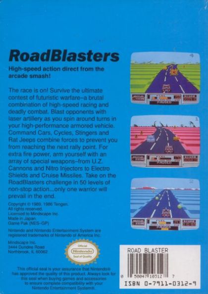 RoadBlasters is a futuristic racing action game. The goal is to reach the finish line in one piece throughout each of 50 levels. Numerous enemies are out on the road to try and stop you, including armored cars, motorcycles, canons on the side of the road, landmines, and more.