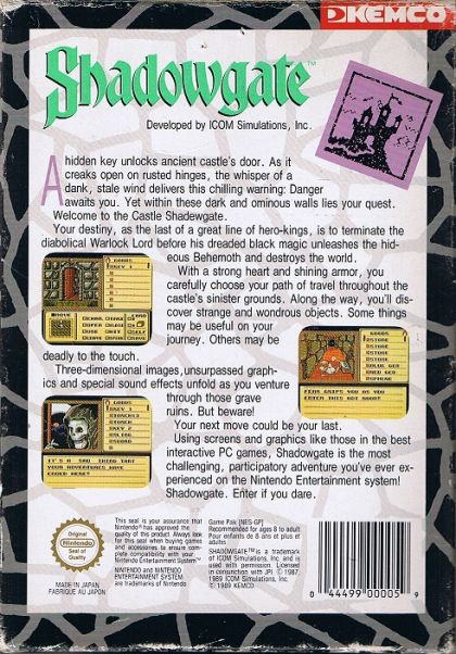 Using the same graphical interface as Deja Vu, Shadowgate is an adventure game set in a fantasy world. Players take the part of an adventurer sent to the ancient keep of Shadowgate on a quest to find a mystic artifact known as the Staff of Ages and stop the evil Warlock Lord from summoning a horrific demon known as the Behemoth. However Shadowgate has become infested with the Warlock Lord's demonic minions, not to mention the castle's still functional booby-traps.
