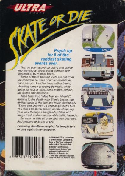 Skate or Die incorporates five distinct styles of skating, which can be attempted individually or in turn. You skate around a menu room to choose which one to attempt. Before taking off you can visit Rodney's skate shop to buy equipment.