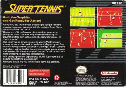 The world circuit of tennis awaits you. Select from 20 male and female players, each with their own style of game play (strengths and weaknesses) and play singles, doubles either against or with a human opponent or a CPU controlled player(s) on all the major surfaces (clay, grass & hardcourt).