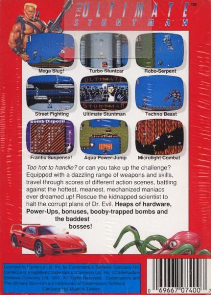 Ultimate Stuntman must fight through 7 worlds with 4 stages each and then through the final world which consists of 3 stages. The game has a variety of different gameplay types. The stages go in the order of an overhead view stage, a side-scrolling stage, a climbing stage with the Android boss, and then a bomb disposal stage.