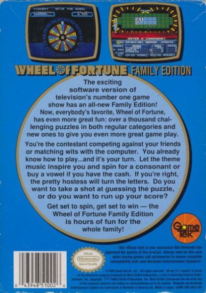 Wheel of Fortune: Family Edition is one of a series of NES games based on the famous TV game show. The goal is to solve a word puzzle by guessing letters. The players take turns spinning a wheel that has designated money amounts in most spaces, but can also bankrupt the player in the wheel lands on the wrong space. A player can guess a letter and if that letter is in the puzzle, those spaces are flipped to reveal the letter and the player earns the cash amount specified by the wheel spin, multiplied by the number of occurrences of the letter. Only English consonants can be guessed-- the 5 English vowels can be purchased using a player's earnings.