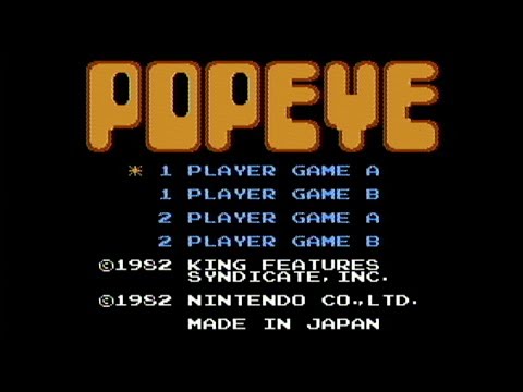 Popeye is a conversion of the arcade action/platform game. As Popeye, you are trying to win Olive Oyl's love! She is at the top of the screen dropping tokens of her love, and you need to collect them before they hit the ground. After you have collected the required number of items, you can move on to the next, more difficult level. There are many obstacles trying to stop you from completing your task, though! Brutus wanders around the screen and is constantly trying to catch you. If you collect a can of spinach, you can temporarily knock him out, otherwise Brutus will knock you out. Other objects such as bottles or birds are also flying around the screen and will cause you to lose one of your lives if you are hit. Each level features a different layout of platforms and ladders, and will have you collecting different items as they float towards the bottom of the screen!