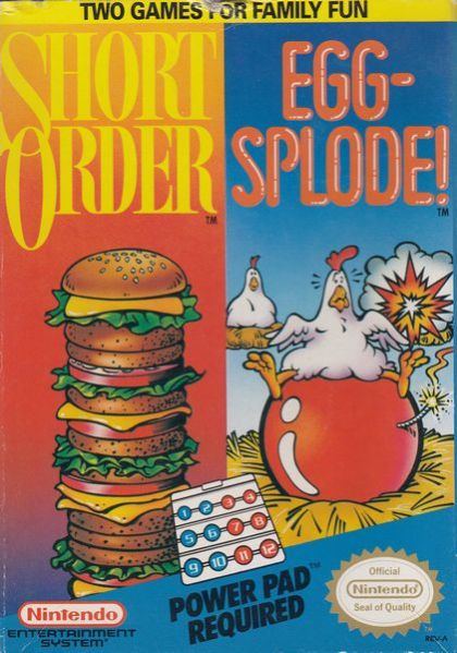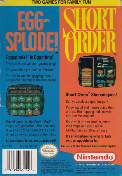 This cartridge used the power pad and contained two games: "Short Order", is a Simon-like game in which you are given an order and need to make the burger exactly as the order says. "Eggsplode" is a game in which you must destroy bombs that a fox is placing underneath chicken nests before they explode without destroying the chickens or their eggs.