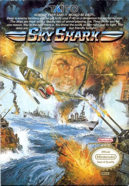 Sky Shark is a top-down shooter similar to Raiden. You start off with four lives and three bombs. With that (you can get more lives at certain point intervals, and more bombs can be found), you, the "Sky Shark" of your squadron, blast through five levels of enemy-infested battlefields with as many as six gun upgrades. (Aside from the bombs and the gun upgrade, there are no other weapons to be found at all.) Includes three difficulty levels and two-player support.