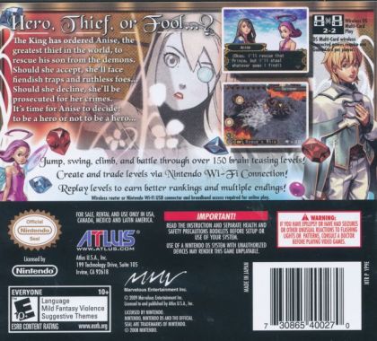 The fairy Kukri, imprisoned for centuries in the chamber Anise inadvertently unlocked, rescues her and takes her to the Castle of Albyon. Anise awakens in the presence of the King, whose son is being held by demons in the very palace Anise narrowly escaped from. Recent events have unshakably convinced the King that this thief is descended from the Legendary Hero of Albyon, he who slew the Ancient Demon King centuries ago, and so he commands her thusly: free the Prince from the vile demons... or be tried and convicted as a thief and locked away for life. Not much of a choice, one way or the other...