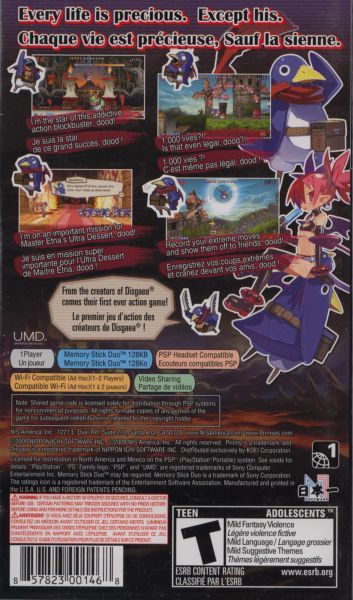 Prinny makes use of the PSP's wireless functionality to record play and download maps and other bonuses. One of its unique features is that, owing to the game's high difficulty, the player gets 1000 lives.