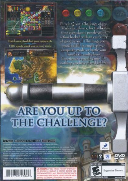 Puzzle Quest: Challenge of the Warlords is a unique combination of classic RPG elements and fun puzzle mechanics. Create your own character and venture off in the world, listening to rumors, taking on quests, fighting monsters, and unraveling the mysteries to be found in the world of the Warlords. Designed specifically to entertain both casual and hardcore gamers with its deep immersion, five to fifteen minute play sessions and turn-based play style, Puzzle Quest: Challenge of the Warlords incorporates strategy, role-playing elements and a persistent storyline in a puzzle board setting.