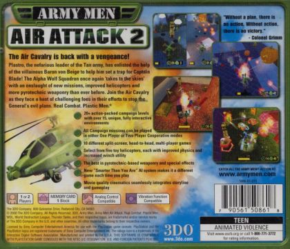 Army Men: Air Attack 2 and its predecessor are shooting games similar to the ones in EA's Strike series. The player controls a green toy helicopter through a suburban setting. The aircraft is equipped with weapons and a winch. At the start of each mission, the player can choose the helicopter model and its co-pilot (whose characteristics modifies the behavior of the airship. For example, a specialist in guns increase the accuracy of shots). The mission objectives vary: there are rescue missions, where the winch is used to collect a character or object, demolition missions, where something has to be destroyed, and escort missions, where something must be protected from enemy attacks.