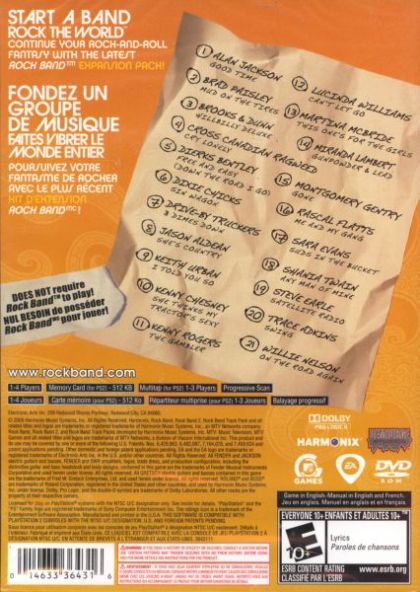 Rock Band Country Track Pack is a standalone software product that allows owners of Rock Band andRock Band 2 to keep the party going with 21 songs from an outstanding mix of country artists, including Kenny Chesney, Alan Jackson, Shania Twain, Rascal Flatts and the legendary Kenny Rogers. Many of the tracks will be exclusive to the Rock Band Country Track Pack disc for a limited time before joining the Rock Band(r) Music Store as downloadable content.