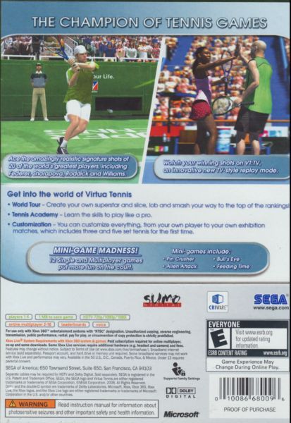 Based on the spectacularly successful arcade version, Virtua Tennis 3 adds dazzling power to the renowned series for next-gen consoles while retaining that easy to play, difficult to master gameplay loved around the world.