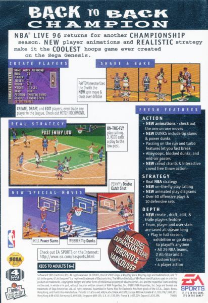 NBA Live 96 is the second installment of the NBA Live video games series. The PC and PlayStation covers features Shaquille O'Neal of the Orlando Magic, while the Super Nintendo Entertainment System and Sega Genesis box covers show a photo of the tip-off to Game 1 of the 1995 NBA Finals. The game was published by EA Sports and released on November 30, 1995. The PlayStation and PC versions were the first games in the series to feature a 3D rendered court, allowing for multiple camera angles using EA's "Virtual Stadium" technology (also used by FIFA Soccer 96 and NHL 96). The on-court player graphics remained 2D sprites. It was also the first NBA Live game released for Sony PlayStation.