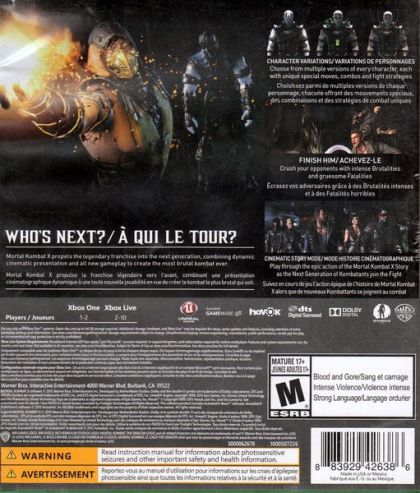 Mortal Kombat X is NetherRealm Studios' next highly anticipated installment in its legendary, critically acclaimed fighting game franchise that propels the iconic franchise into a new generation. The game combines cinematic presentation with all new gameplay to deliver the most brutal Kombat experience ever, offering a new fully-connected experience that launches players into a persistent online contest where every fight matters in a global battle for supremacy. For the first time, Mortal Kombat X gives players the ability to choose from multiple variations of each character impacting both strategy and fighting style. Players step into an original story showcasing some of the game's most prolific characters including Scorpion and Sub-Zero, while introducing new challengers that represent the forces of good and evil and tie the tale together.