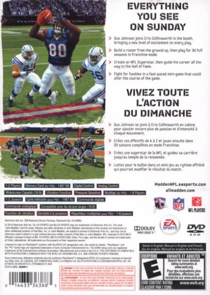 Madden NFL 11 is an American football video game based on the National Football League published by EA Sports and developed by EA Tiburon. It is the 22nd annual installment in the bestselling Madden NFL video game franchise. It was released on August 10, 2010 in North America, and on August 13 in Europe. It was released for the PlayStation 3, PlayStation 2, Wii, Xbox 360, PlayStation Portable, and iOS platforms, with the Nintendo 3DS and Android versions to be released in the future. The PS3 and Xbox 360 demos were released on July 27, 2010.