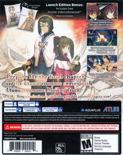 The epic story of Utawarerumono comes to an end in Mask of Truth , as the fate of the world will be determined by warring nations. The game features exciting SRPG battles, a colorful cast of new/familiar faces that will determine the fate of their world, a rousing original soundtrack, and the dramatic conclusion to the journey of Haku. After the events of Mask of Deception , Haku is destined to rally the nation of Ennakamuy to fight against the evil forces that now control the Yamato throne. With everything on the line, Haku and his friends must do everything in their power to ensure that the future of Yamato triumphs over the true evil that lurks in the depth of the darkness. Return to the World of Utawarerumono Mask of Truth begins where Mask of Deception left off, and will immediately thrust players back into Haku\'s journey with its immersive visual novel story telling. A Grand Tale Ends The 70 hours adventure contains more lore/history/locale to discover, secrets to be revealed, relationships to build with old and new characters, the climactic finale to the series, and more. Fight for the Rightful Heir of the Yamato Throne Players will need to lead the team of rugged warriors into combat and utilize the updated Battle System to achieve victory. The addition of Co-op attacks and strikes add another strategic layer to the exciting SRPG battles. Languages The story will be told in its powerful original Japanese voice acting with English subtitles.