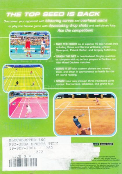 Choose from 16 internationally ranked men's and women's tennis players to compete in singles, doubles and even mixed doubles matches! The World Tour Mode lets you create and train your players, sign unique doubles partners and enter a host of prestigious tournaments. Lob, slice and smash your way to victory with intuitive pick-up-and-play controls designed to cater to all levels of gamers. Just remember to keep your eye on the ball. "SEGA Sports Tennis'" intense four-player action might distract you from noticing the large variety of beautifully rendered stadiums along with the multiple playing surfaces. But who could ignore dynamic cross-court shots, diving saves and devastating drop shots! Get ready to break out your racket and keep the ball in the PlayStation 2 court for the most intense tennis action anywhere!