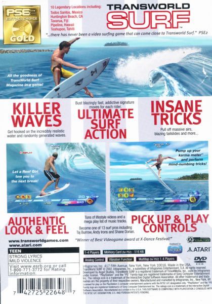 TransWorld Surf allows you to use the moves that made guys like Taj Burrow, Andy Irons, and Shane Dorian famous to pull off massive airs, blazing tailslides, and hundreds of other mind-numbing tricks. Drop into over 20 of the world's sweetest breaks and get hooked on incredibly realistic water. Transport yourself to internationally renowned surf locales including Todos Santos, Hossegor, and Tavarua. Surf against your friends in exciting multiplayer modes including Shark Attack and King of the Wave. Learn how the pros do it by watching real surf videos. Create your own kickin' soundtrack with the more than 50 music tracks. Hitch a ride with the Reef Girls, watch out for the hungry sharks, and remember to save your best moves for the TransWorld photographers who just may put you on the in-game cover of TransWorld Surf.