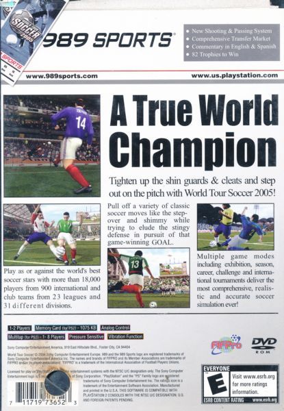 The World Tour Soccer series furthers the global soccer experience with its latest installment. World Tour Soccer 2005 now offers more than 900 international and league teams from around the globe--18,700 players from 30 divisions and 22 leagues, including classic teams, from the past. Guide a team through exhibition matches, entire seasons, careers, or single-player and multiplayer challenges. World Tour Soccer 2005 also features a new icon-passing system, detailed stadiums, and intuitive controls.World Tour Soccer 2005 captures the enormous size and popularity of what is truly the world's game. Multiple modes of play including Exhibition Match, Season, Career, and Challenge Mode give the sports gamer the opportunity to get in and play a quick game with a friend or battle it out in a grueling season where they'll have to manage player contracts, trades, salary caps and injuries. So the battle for victory will once again begin in stadiums filled with passionate fans as they support their team with electrifying chants while waving their club and country flags.