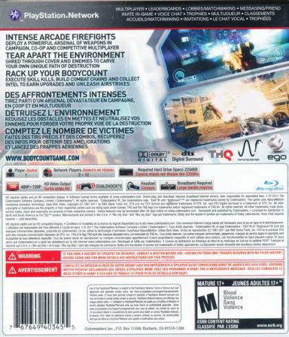 In Bodycount players become ensnared in a clandestine global power struggle as a powerful combat asset with a green-light to eliminate enemies known only as 'Targets' on behalf of the 'Network'. Equipped with a mouth-watering selection of contemporary weapons, players and opponents tear through destructible cover to execute explosive kills in a shreddable world where operatives are encouraged to leave no witnesses. Complimented by online multiplayer and co-operative game modes, Bodycount will blast outrageous action and spectacular fire-fights from both barrels.