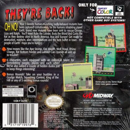 Your 3 favorite human-muching, badly-behaved mutants have been captured! Unfortunately, for the humans inhabiting planet Earth, brand new mutants have been sent to rescue George, Lizzy and Ralph. You'll meet Ruby the Lobster, Boris the Rhino and Curtis the Rate as they destroy cities in North America, Asia and Europe! Get ready for destruction, mayhem, alien exterminations and the best buffet in town - the people of Earth!
