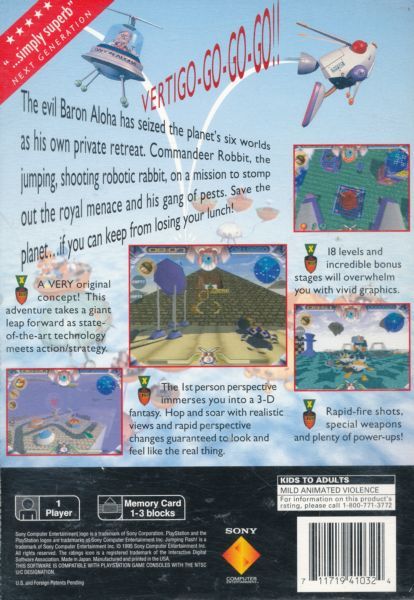 The evil Baron Aloha has seized the planet's six worlds as his own private retreat. Commandeer Robbit, the jumping, shooting robotic rabbit, on a mission to stomp out the royal menace and his gang of pests. Save the planet... if you can keep from losing your lunch!