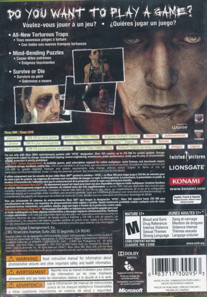 Step into the dark and tormented world of Saw 2 and experience the gruesome traps that Jigsaw has created to test your will to survive. With new traps, puzzles, and combat system players will need to think fast and act quick to pass the rigors of the tests Jigsaw has engineered. Set between the Saw and Saw II movies, the game follows Detective Tapp's estranged son Michael, who become Jigsaw's next subject while he is investigating father's recent death.