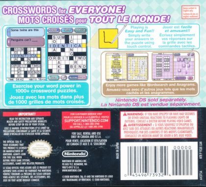 Game description: Choose from more than a thousand crossword puzzles or hone your word skills with Wordsearch or Anagrams. No matter which type of puzzle you choose, you can easily save your progress at any time and return later to finish. Crosswords DS is designed for all playersjust select your difficulty level and start off with a basic four-by-four puzzle. As you progress, the game will increase in difficulty and puzzle size. Use the DS stylus like a pencil to write or circle your answers on the touch-control screen. Erasing mistakes is as simple as writing the new answer over the old one. A hint system is also included in case you need some friendly assistance.