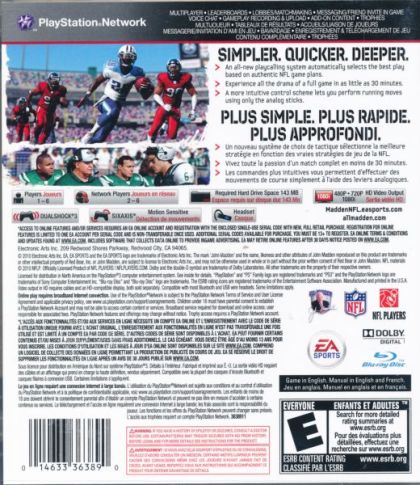 Madden NFL 11 redefines the way you experience the game of football. SIMPLER: From 350 plays down to 1, the all-new GameFlow system puts you in the helmet of an NFL quarterback to execute an authentic, situational game plan, one play at a time. QUICKER: 60 minute game times reduced to as little as 30 minutes; spend more time on the field and less in the playbook. FULL games, HALF the time. DEEPER: Madden NFL 11 is feature-rich including all-new 3-on-3 Online Team Play, improved animations, more intuitive controls, and Madden NFL Ultimate Team...all to the play-by-play of the most exciting voice in sports, Gus Johnson. Madden NFL 11- SIMPLER. QUICKER. DEEPER than ever before.