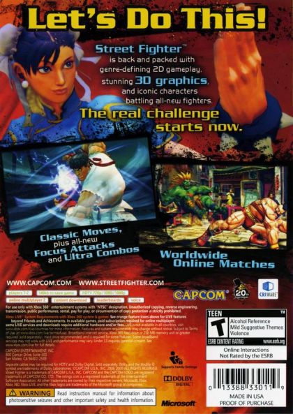 Street Fighter IV features a mix of returning favorites such as Ryu, Ken, Chun-Li and Guile along with new characters created for this game, such as Crimson Viper, Abel, El Fuerte, and Rufus. Characters and environments are rendered in stylized 3D, while the game is played in the classic Street Fighter 2D perspective with additional 3D camera flourishes. Six-button controls for the game return, with a host of new special moves and features integrated into the input system. Mixing classic genre-defining game mechanics the franchise is known and loved for with all-new, never-before-seen gameplay systems, Street Fighter IV brings a brand new fighting game to fans the world over. With the inclusion of Capcom's latest advancements in new generation technology, Street Fighter IV promises to deliver an extraordinary experience that will re-introduce the world to the time-honored art of virtual martial arts.