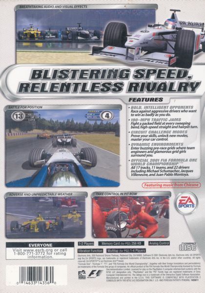 Battle for position at every sweeping bend, high-speed straight away, and hairpin turn within the worlds most glamorous sporting arena. From Monaco to Monza, take on the most intelligent and daring racers to hit the Formula One circuit. The circuit comes to life with fully interactive pit stops, roaring crowds, a buzzing grid, driver animations, and a full spectrum of driving conditions, including torrential downpours and other mid-race weather changes. Add the official 2001 FIA Formula One World Championship license and F1 2001 is poised to reach new milestones in motor sports gaming.