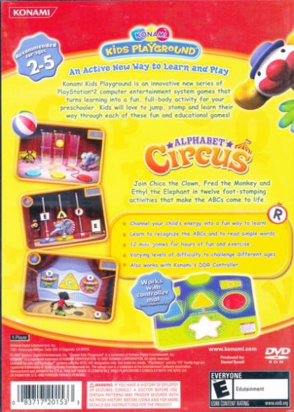 Konami Kids Playground is an innovative new series of PlayStation2 games that turns learning into a fun, full-body activity for your preschooler. Kids, aged 2 to 5, will love to jump, stomp and learn their way through each of these fun and educational games! Kids will have hours of fun exploring the colorful world of the circus, and parents will appreciate the simple challenges that reinforce familiarity with the alphabet.