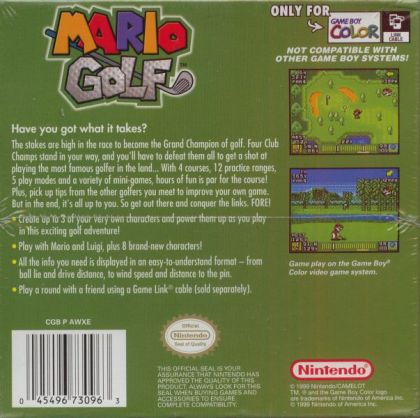 Mario Golf on Game Boy Color isn't a straight port of the N64 game - it's a totally different game in its own right. It is a combination of a golf game and an RPG. As in an RPG, you choose your character at the beginning, with various strengths and weaknesses, and throughout the course of the game, your character gains experience points through winning matches or playing mini-games. Experience points can be distributed to various skills, such as putting, which makes it easier for you to do well. There are quite a few skills, and no two characters you can create will play in exactly the same way.