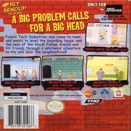 This is a jump 'n run game based on the movie of Nickelodeon's popular TV show Hey Arnold. The player can play several characters from the TV series (Arnold, Gerald, Grandpa and Grandma and Helga as hidden character). It follows the story of the movie where the player has to save the neighborhood from the show. The game features five different areas (City Area, Indoor, Building, Underground and another City Area). Saving is done via passwords that save every detail of progress such as remaining lives or collected coins.