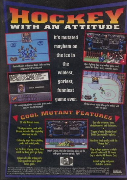 Mutant League Hockey is a violent hockey game in the same series as Mutant League Football. There are 23 bizarre hockey teams to choose from, with players consisting of zombies, skeletons, trolls, and robots. The arenas are equally strange, with hidden bottomless pits, mines placed under the ice, spikes, and a "Demon Net" that functions as a goalie by chomping up and down and devouring the puck. The game plays similar to normal hockey, except in this game your players can pick up chainsaws, maces, axes, etc. to use against the competition. It's a bloody game, with opponents exploding into piles of goo (or circuits if they are a robot) when they become too injured. The player can call special plays, like an exploding puck or jail break and attack the goalie. The game also has fighting sequences if two players decide to get into a brawl. The game comes with multiplayer and a playoff series, full stats for your players and instant replays.