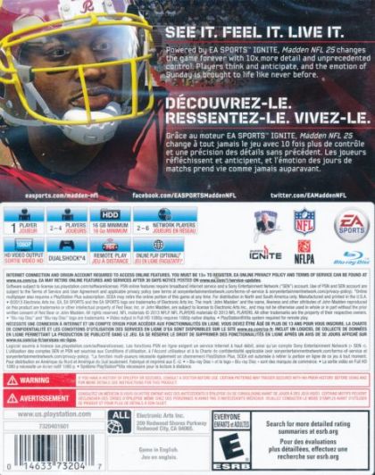 Celebrating 25 years of innovation, Madden NFL 25 unlocks the power, precision, and creativity of the NFL ball-carrier. Whether you're a slashing running-back, dual-threat QB, or ball-hawking safety, unleash 30 new moves and string together devastating combos with the all-new precision modifier in Madden NFL 25.