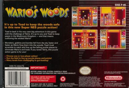 Wario's Woods is a puzzle game, developed and published by Nintendo, for both the Nintendo Entertainment System and Super Nintendo Entertainment System. The NES version was released in Japan on February 19, 1994, and both versions were released simultaneously in North America on December 10, 1994. Because of the increasing popularity of the Super NES, Wario's Woods was the last licensed game released for the NES, and is also the only game in its library to have an official rating by the ESRB.
