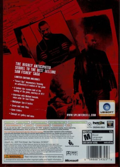 Veteran agent Sam Fisher is back. But he's never faced an enemy like this before. To stop a devastating terrorist attack, he must infiltrate a vicious terrorist group and destroy it from within. For the first time ever, experience the relentless tension and gut-wrenching dilemmas of life as a double agent. As you infiltrate a terrorist organization in its American headquarters, you must carefully weigh the consequences of your actions. Kill too many criminals and you'll blow your cover. Hesitate too long and millions will die. Do whatever it takes to complete your mission, but get out alive.