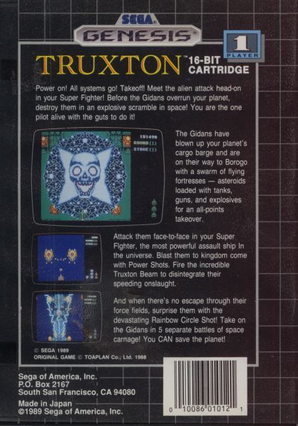 Originating in the arcades, Truxton is a vertically scrolling shooter. The player controls a fighter craft that has to eliminate the enemies with primary weapons or bombs. The basic weapon comes in three varieties: Power Shot (small spreading projectiles), Sun Laser (a powerful, fast-moving straight laser beam, and Truxton Beam (an electric beam that spreads in all directions if the player is holding down the fire button).