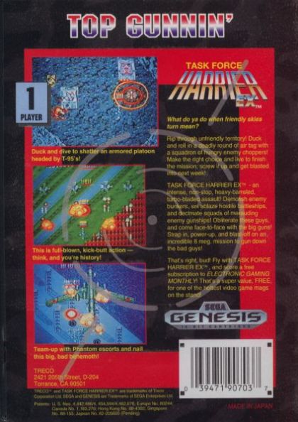Task Force Harrier EX is a vertical scrolling shooter video game for the Sega Genesis. It was released in 1991 for the North American and Japanese markets.