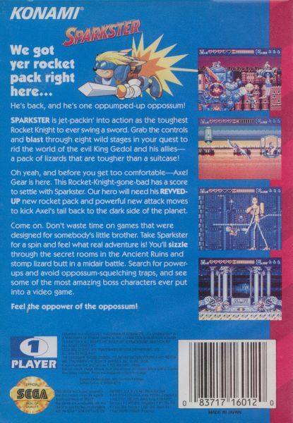 Sparkster is the sequel to Rocket Knight Adventures and is completely different from the contemporary SNES title Sparkster. It takes place immediately after the events of the first game. The interactive introduction scene shows Sparkster picking up a new sword after the final fight when his nemesis Axel Gear appears, the rocket knight gone evil. After a fight in giant robots, Sparkster manages to save Princess Cherry and returns her to the queen. Then suddenly Axel appears again and he kidnaps her. It turns out Axel is working once more for the Empire of Gedol. Sparkster has to return the peace in Kingdom of Zebulos, save the princess and bring an end to the evil empire.