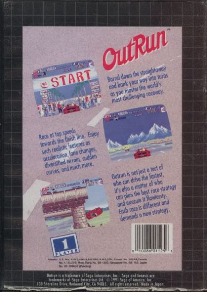 OutRun is a racing game originating in the arcades. The player can race across varied terrain in a readily available Ferrari, complete with a female passenger, over a series of short tracks.
