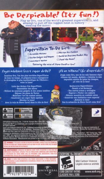In Despicable Me: The Game, players will experience the inventiveness of being a despicable genius as they become Gru, the film's criminal mastermind, planning heists and plotting attacks on Gru's archnemesis, Vector, as they work their way to villainous greatness. Despicable Me: The Game offers a unique blend of action and puzzle solving that combines the fun of commanding an army of loyal-but-manic minions and using an arsenal of wacky gadgets, weapons and vehicles to entertain players of all ages.