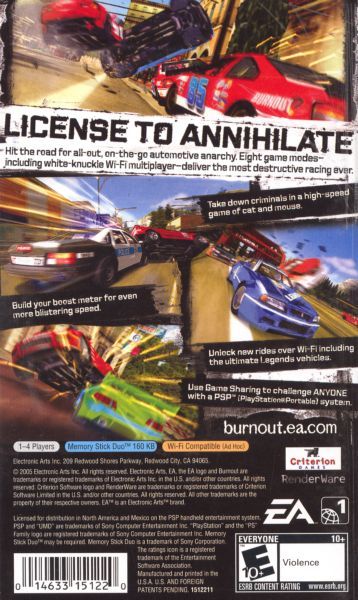 Gamers can also spend endless hours with the Burnout Legends suite of multiplayer options, including WiFi showdowns, customizable mini-championships and a wireless Game Share option where friends can play head-to-head with one UMD.