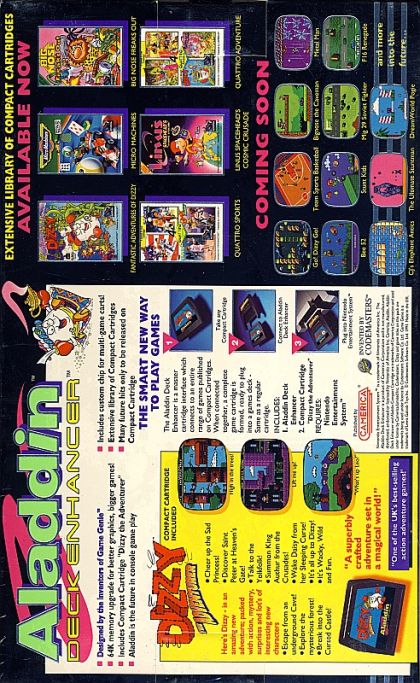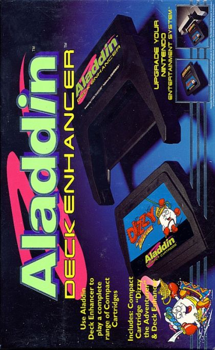 The Aladdin Deck Enhancer, produced by Camerica, and developed by Codemasters, is a cartridge based system that allows software on Compact Cartridges to be played on the Nintendo Entertainment System. It is similar to the Datach system for the Famicom, but without the Barcode feature. It was released in November 1992, with its planned library to reach a total 24 games by the end of 1993, however only seven games were released.