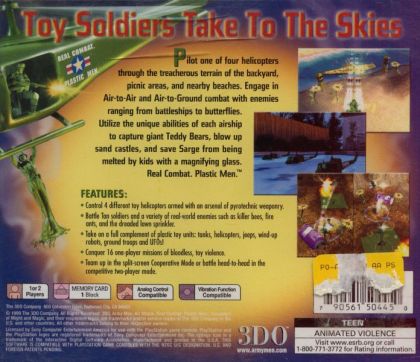 Army Men: Air Attack puts you in the cockpit of a miniature helicopter as you fly sorties for either the green or the tan army. With the new Captain William Blade leading the campaign, your objectives in the 16 different missions range from rescuing hostages, guarding trains, exterminating bugs, to just plain wiping out every enemy in sight. Four different plastic helicopters are at your disposal, each with machine gun, homing rockets, napalm, and everything else you would ever want for total annihilation. Have a friend join you in the co-op mode or the deathmatch mode to battle it out for air supremacy.