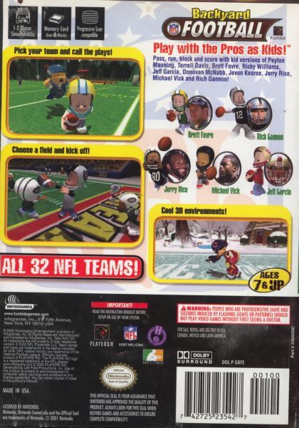 It's great Football action playing with the Pros as kids Backyard Football teams up with the NFL to bring kid versions of the best tackling, deepest passing and fastest running Pros. Choose from all 32 NFL teams or creating your own with custom team names and uniforms. Pick a playing field, call the plays and direct all the action in single games or an entire season's worth of hard-hitting action. It's the chance of a lifetime to play with the pros right in your own backyard!